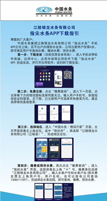 中国水务集团“指尖水务”APP手机软件,江陵银龙水务有限公司已实现在线查询、预存、缴纳水费。